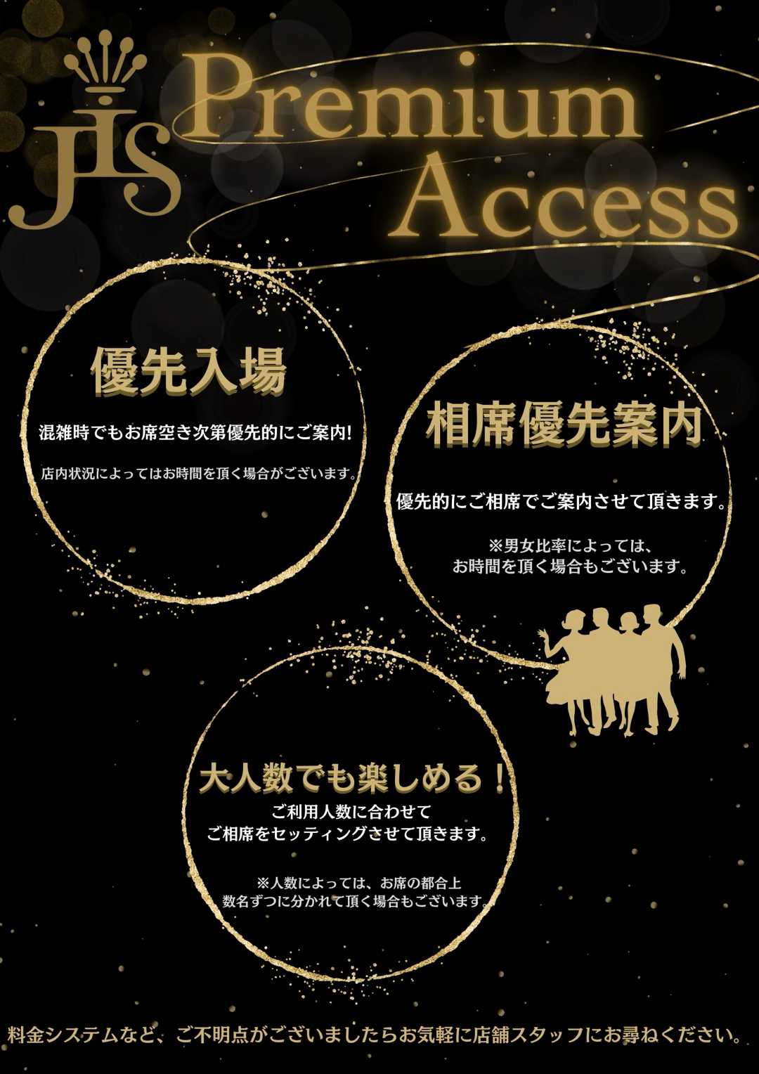 通常プランにはない優先入場や相席優先案内など上質なサービスを含めたプランです。【料金】
